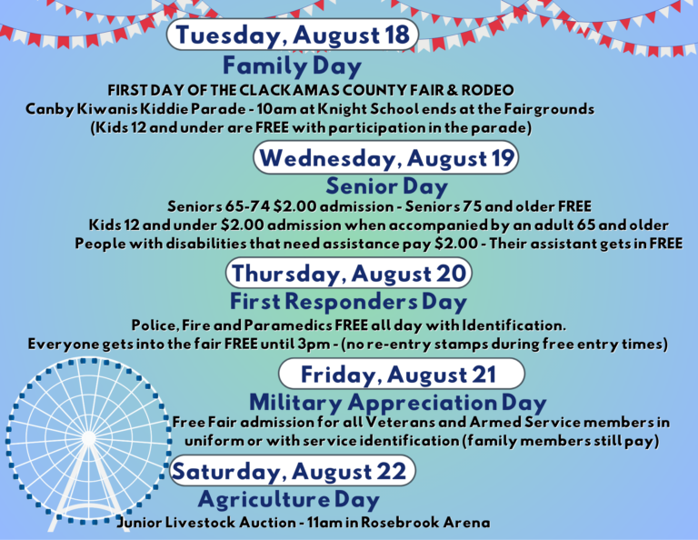 Plan your visit best by taking a look at the Clackamas County Fair schedule. Find the day and time your favorite activity of the Fair will begin.